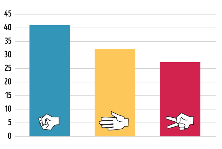 1. Опитування 100 чоловік показав, як розподіляється вибір у грі «Камінь, ножиці, папір».