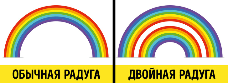 8. Якщо подвійна веселка, то смужки в кожній з них будуть йти в різних напрямках: у однієї внизу буде червоний колір, а в іншої — фіолетовий.
