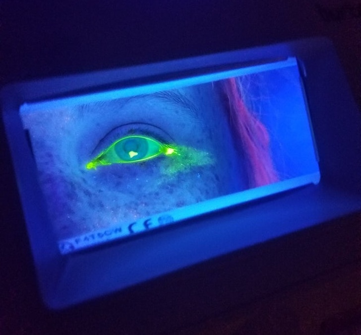 6. Якщо на оці є подряпина і потрібно з'ясувати, де вона, окулісти капають UV-барвник і визначають за світінням, де знаходиться пошкодження. На цій фотографії садно в нижній частині зіниці.