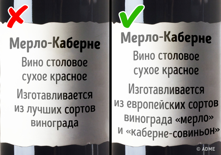 Бажано, щоб на етикетці були вказані сорти винограду, з яких виготовили вино. Дуже часто на дешевих винах пишуть «з кращих сортів винограду». Але, швидше за все, це тільки залишки кращих сортів. Винятком є Франція — там не дозволено вказувати, з яких сортів винограду виготовлено вино, вірніше, не дозволяється тільки для внутрішнього виробництва на експорт це не заборонено.
