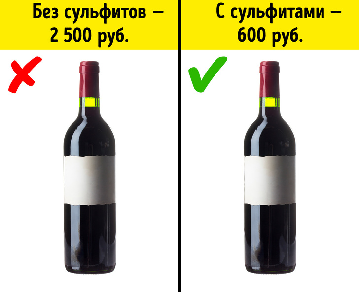 Часто на етикетках можна зустріти напис, що в вині міститься діоксид сірки (E220). Багатьох це насторожує, але варто знати, що діоксиди містяться практично в кожному напої в невеликій кількості (всього 10 мг/л), так як це результат продуктів бродіння. Однак якщо діоксид сірки додатково не додати вино, то збільшаться витрати на зберігання — доведеться створювати спеціальні сховища з постійним кліматом, а це дуже дорого і трудомістко.