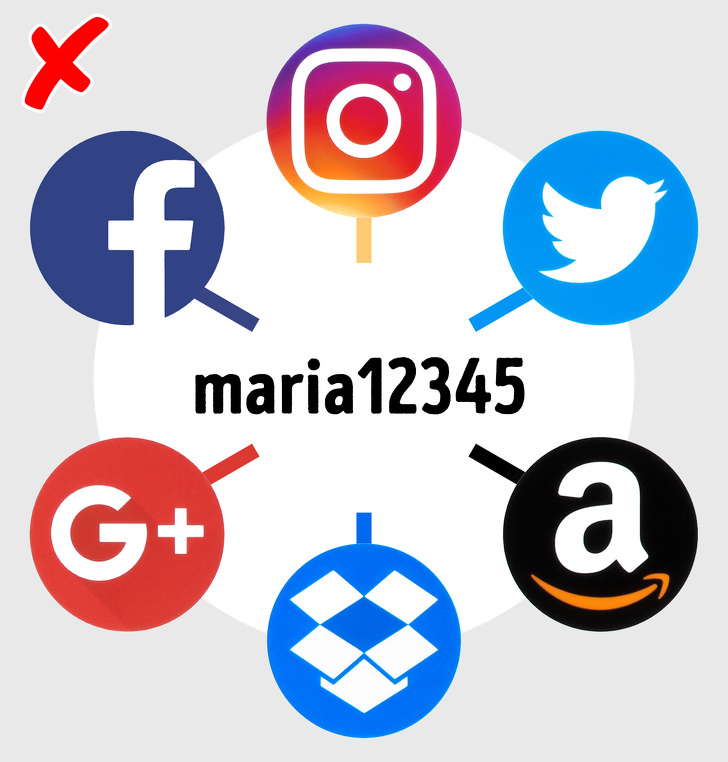 - Один і той же пароль для всіх сайтів, облікових записів. Як тільки хакерська програма підбере вірний пароль до одного з ваших акаунтів, вона тут же застосує його до решти. На жаль, але, згідно з дослідженням 2012 року, 60 % людей ставлять один пароль для більшості використовуваних сайтів.