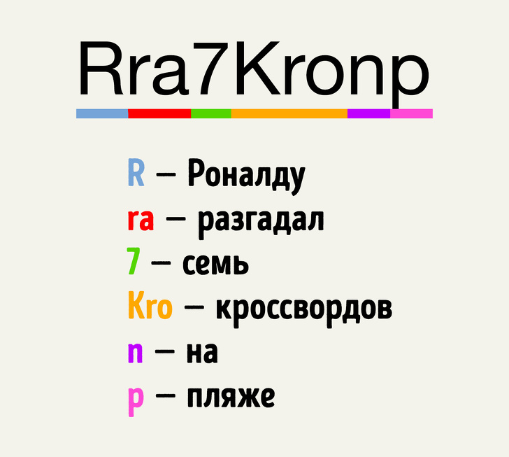 - Щоб запам'ятати надійні паролі, експерти радять зробити зі складного поєднання своєрідну абревіатуру. На кожну букву, цифру і символ придумайте асоціації і зберіть з них речення. Наприклад, поєднання WIw7,mstmsritt англійською можна індивідуально розшифрувати як When I was seven, my sister threw my stuffed rabbit in the toilet («Коли мені було 7, моя сестра викинула мого кролика в унітаз»).