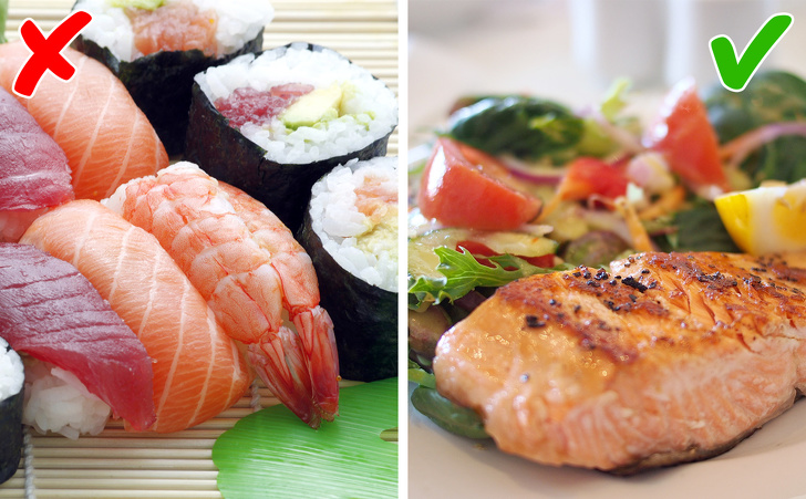 Що стосується суші, то це блюдо здатне більше зашкодити, ніж принести користі. По-перше, в сирій рибі можуть мешкати численні паразити. По-друге, в соєвому соусі міститься занадто багато солі. А по-третє, в суші додається так мало риби, що говорити про помітну користь для організму не має сенсу.