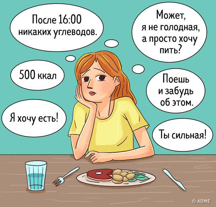 «На перекус 5 горішків, наступний прийом їжі через 4 години», «Цікаво, я стану жирної, якщо співаємо вуглеводів після 18:00?», «По дорозі з роботи потрібно купити 7 пачок знежиреного сиру, інакше доведеться голодувати весь тиждень», «Просто подивлюся на це тістечко, але їсти не буду».