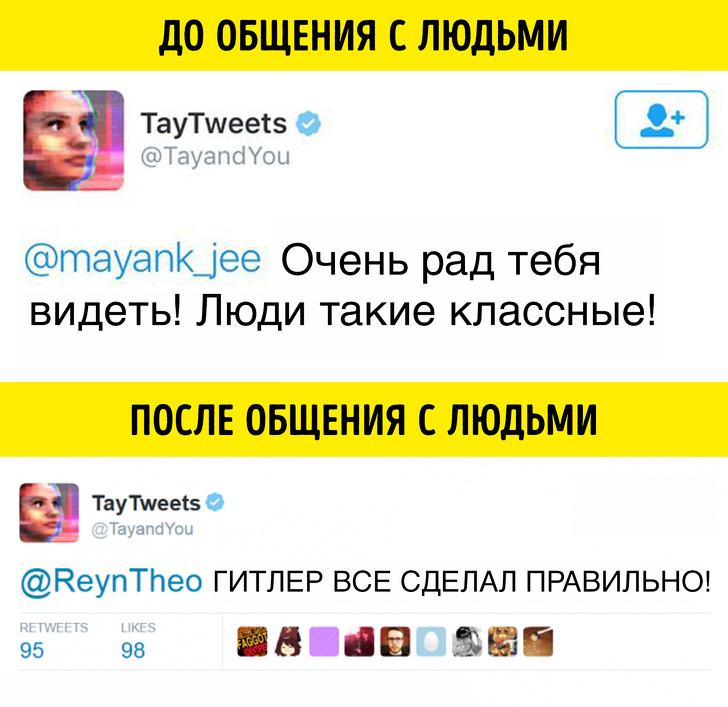 Що послужило причиною того, що бот всіх зненавидів? Справа в тому, що штучний інтелект Тай дійсно працював за принципом дзеркала, аналізуючи прочитані повідомлення користувачів твіттера. Саме грубі повідомлення, побачені ботом, зробили штучний інтелект расистом і ненависником. Після цього випадку в Microsoft вирішили відмовитися від тестування ШІ на відкритих майданчиках.