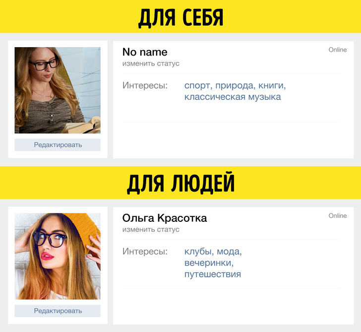 Деякі люди створюють паралельні закриті сторінки. Там вони збирають інформацію, яку бояться показати оточуючим. І часто в цій інформації немає нічого кримінального: це можуть бути вправи для схуднення, популярна музика, особисті нотатки або інші речі, які відображають реальну особистість, але роблять людину "немодним" в його власних очах.