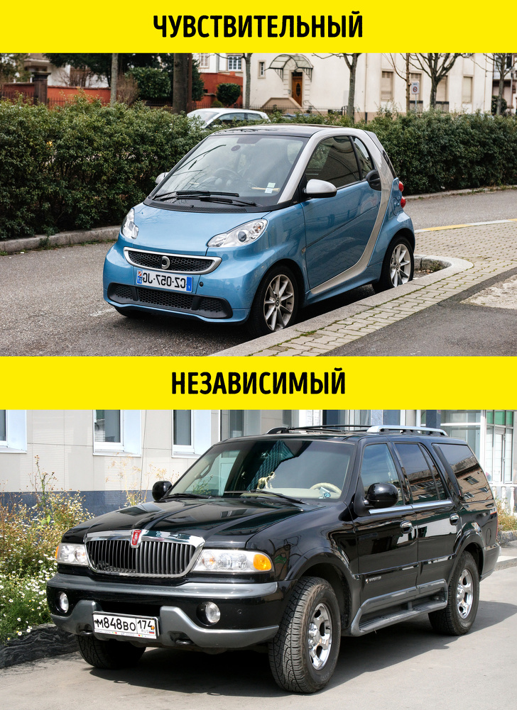 Існує думка, що велика машина говорить про приховані комплексах власника. Насправді за кермом позашляховиків часто сидять цілком упевнені в собі чоловіки і жінки. Вибір масивних авто говорить швидше про незалежність, азартності і волелюбність водія. Любителі ж мініатюрних автомобілів зазвичай чутливі і практичні натури. Вони не женуться за статусність і нерідко вибирають малолітражки, щоб знизити шкоду навколишньому середовищу.