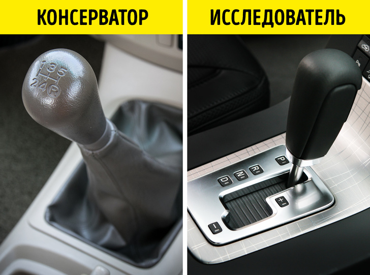 Механіка або автомат? Принципове неприйняття одного і прихильність іншій можуть багато розповісти про особистості. Люди, які свідомо обирають авто з механічною коробкою передач, більш консервативні. Їм важливо відчуття, що вони самі тримають ситуацію під контролем. Вони не бояться відповідальності, але іноді схильні брати на себе занадто багато завдань із-за труднощів з делегуванням. Коробку-автомат вибирають люди, більш легкі на підйом. Як правило, вони швидше відкриваються новому, лояльно ставляться до оточуючих, проте можуть бути менш уважними.