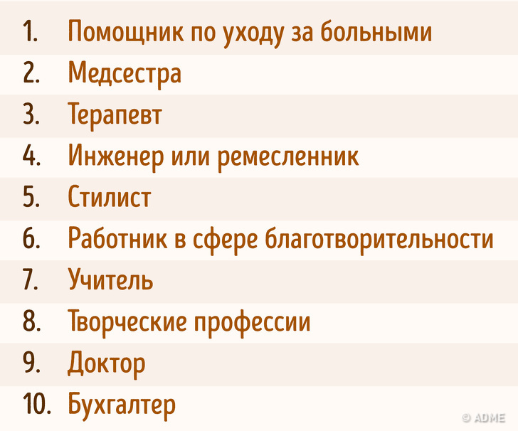Це посади, які більшою мірою пов'язані з турботою про інших людей або в яких мало стресу і спокійна обстановка.