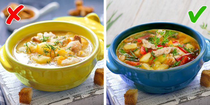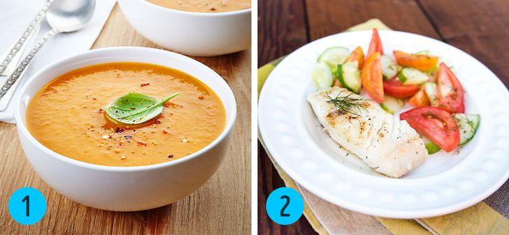 Візьміть за правило є низькокалорійний суп перед їжею, така звичка допоможе вам швидше розпрощатися із зайвими кілограмами. Дослідження вчених Пенсільванського університету показують, що прийом супу до обіду скорочує загальну кількість калорій під час прийому їжі на 20 %. При цьому склад супу не грає особливої ролі, головне, щоб калорійність порції була не більше 100-150 калорій.