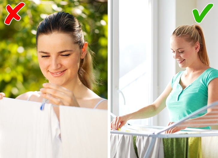 Сушити одяг на балконі, а вже тим більше на вулиці — пропаща справа: алергени осідають на ній і можуть спровокувати напад, як тільки ви цю одяг надягнете. Краще купіть кімнатну сушарку для одягу.