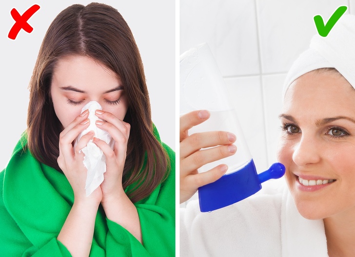 Щодня зрошує порожнину носа і рота фізіологічним розчином або дистильованою водою. Ця процедура полегшить дихання, вимиє алергени і прибере накопичений слиз.