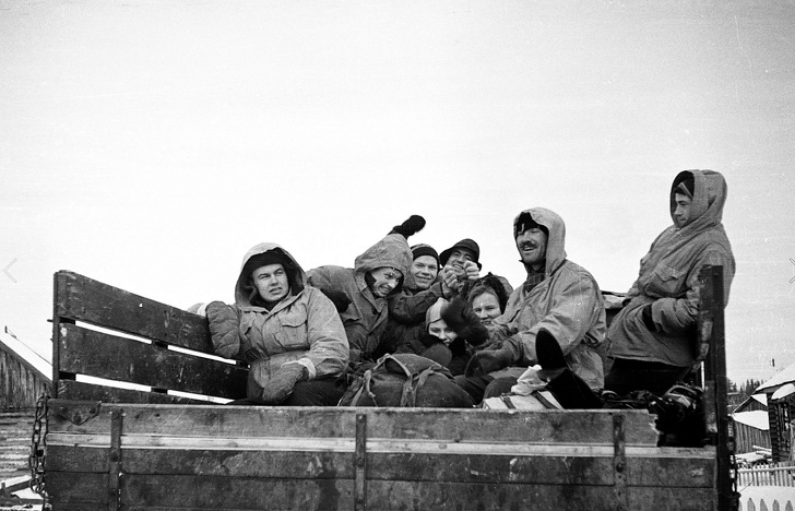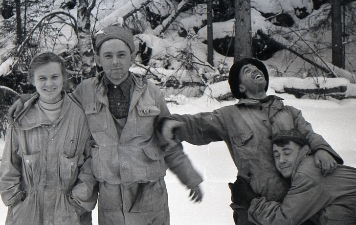 Хлопці веселяться на привалі (зліва направо: Дубініна, Кривоніщенко, Тібо-Бриньоль, Слободін).