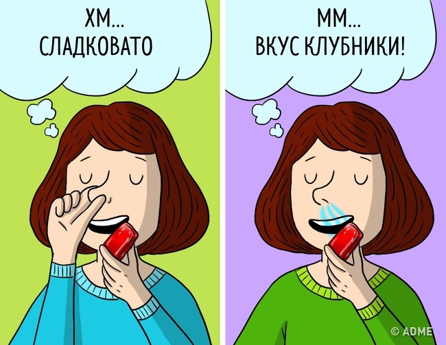 Вчені стверджують, що лише комбінація смаку і запаху допомагає нам пізнавати смак продуктів. Щоб у цьому переконатися, досить пожувати мармелад із затиснутим носом — ми відчуємо солодкуватий присмак на язиці, не більше. Лише якщо ми вдихнемо на повні груди, мармелад заграє гамою смаків — від яблучного до лимонного. Більш того, наш мозок за роки життя створює свого роду базу з «нюхових образів», з допомогою якої ми можемо розрізняти складні запахи.
