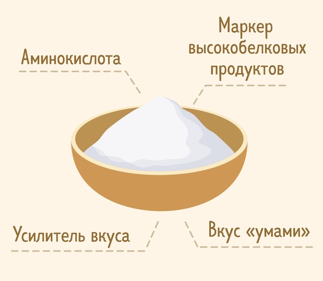 Глутамат натрію не має власного смаку, але підсилює смак продукту, в який додається. Людська мова має спеціальні рецептори, відповідальні за смак під назвою «умами» — смак високобілкових речовин. Коли мова його відчуває, організм сприймає смак їжі інтенсивніше, тому що чує сигнал: «у цій їжі багато білка». Так ось глутамат натрію дає відчуття спокою.