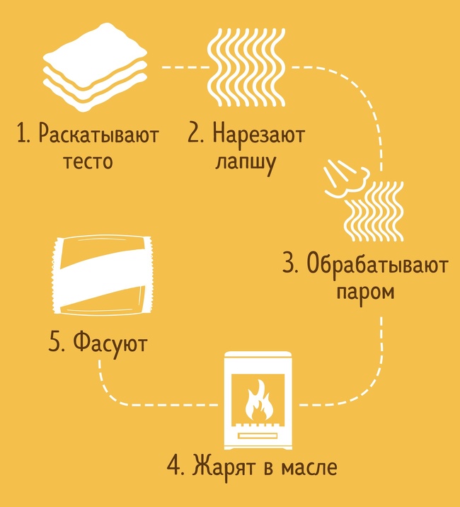 Ключова технологія — це обсмажування локшини в маслі. Саме завдяки термообробці локшина за хвилину розмокає в окропі.
