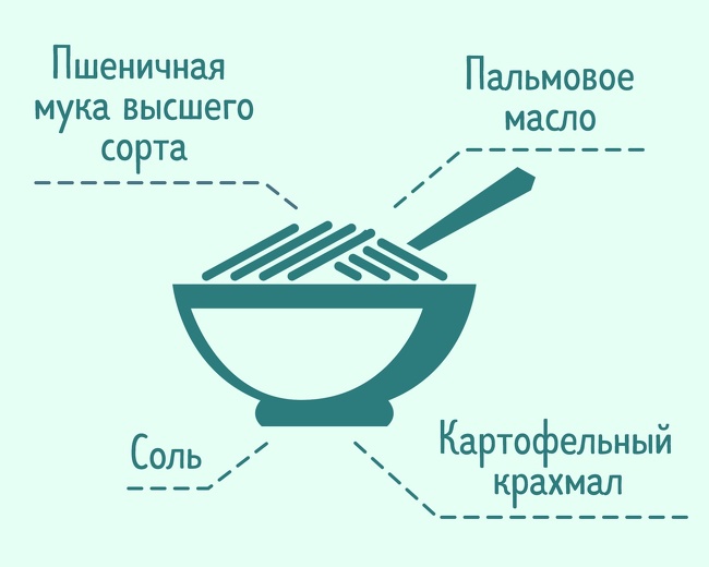Склад самої локшини абсолютно звичайний. Не корисний, дуже «порожній» і разом з тим калорійний. А вся хімія зосереджена в бульонной добавці.