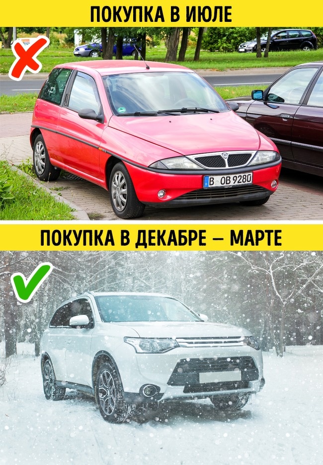 Найвигідніший час для покупки нової машини починається в грудні і досягає свого піку в березні. В цей час в автосалонах діє найбільша кількість знижок і спецпропозицій. Крім того, часто при купівлі автомобілів, вироблених в кінці року, ви маєте приємний бонус: такі машини за рівнем устаткування відповідають наступного модельного року, маючи при цьому більш низьку вартість.
