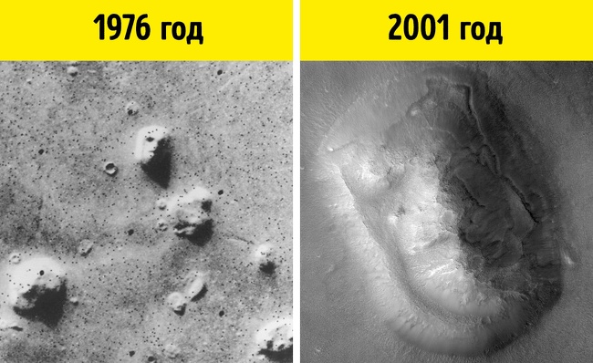 У 1976 році «Вікінг-1» зробив знімок поверхні Марса, на якому чітко були видні обриси людського обличчя. Цей знімок відразу ж викликав шквал теорій про штучне походження рельєфу, до створення якої доклали руку інопланетяни. Проте вже в 1998 році більш детальні знімки остаточно зруйнували міфи про те, що на Марсі є загадкове обличчя: при найближчому розгляді виявилось, що це не що інше, як гра світла і тіні.