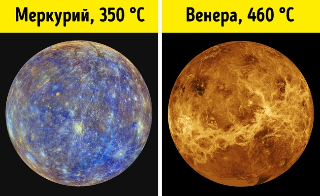 Здавалося б, все логічно — Меркурій перебуває найближче до Сонця, а значить, воно раскаляет його сильніше, ніж інші планети. Проте в гонці за найспекотніше місце в Сонячній системі перемагає Венера: середня денна температура на її поверхні становить близько 460 °C, тоді як на Меркурії відносно прохолодно, всього 350 °C. А вночі, яка на першій планеті від Сонця триває цілих 58 земних днів, і зовсім падає до -170 °C.
