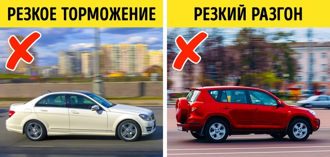 Різкий розгін і різке гальмування шкідливі для автомобіля. Вони дають додаткове навантаження на системи автомобіля: так, величезне навантаження отримують коробка передач і двигун, сильно зношуються колодки і гальмівні диски, знижується працездатність гальм. Усе це різко підвищує ймовірність аварії на дорозі.