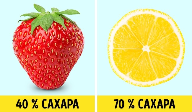 Полуниця містить 40 % цукру, а лимон — майже вдвічі більше. Ми не помічаємо цього з-за великої кількості лимонної кислоти, яка міститься в них. Більше того, така кількість цукру в лимонах може викликати ожиріння, якщо їх занадто багато, але лимонна кислота навряд чи допустить це.
