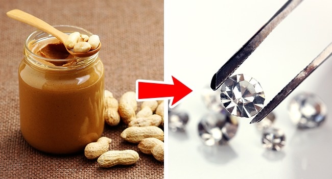Вчені з Німеччини на чолі з Деном Фростом встановили, що в арахісовому маслі міститься досить багато вуглецю, а значить, його можна перетворити на діаманти. Для цього спочатку необхідно повністю видалити з продукту весь кисень, а потім піддати його величезному тиску, щоб відбувся процес перетворення. Оскільки всі продукти харчування (і, якщо на те пішло, всі живі істоти) містять вуглець, це дослідження дозволить у майбутньому створювати алмази з різних предметів. Звичайно, натуральні діаманти все одно будуть більш цінними.