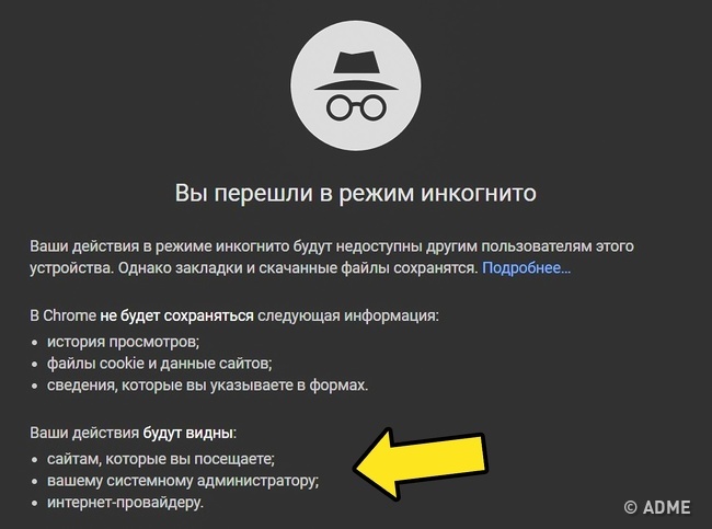 Багато користувачів просто не дочитують те, що написано у вікні браузера, коли переходять в режим інкогніто. Насправді він стирає лише локально збережені дані. Будь зовнішнє джерело (відвідані веб-сайти, інтернет-провайдер, адміністратор мережі) все ще може відстежити вашу активність.