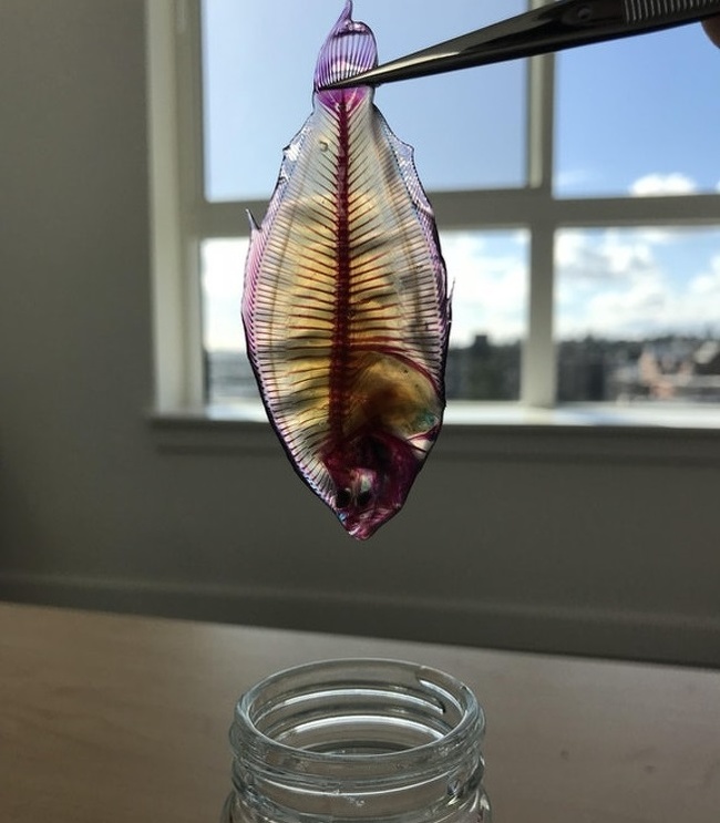 Ця риба пройшла хімічний процес, який робить шкіру і органи прозорими, кістки — червоними, а хрящі — синіми
