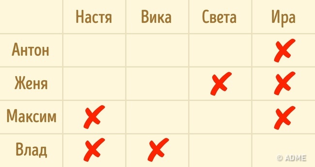 І нарешті, третя таблиця: хто з хлопців яку дівчину вітав. Тут ми відразу бачимо, що Влад привітав Іру. У неї точно не букет квітів, а сам Влад не купував ні плюшевого ведмедя, ні духів. Значить, подарунок Іри — вазон з квіткою.