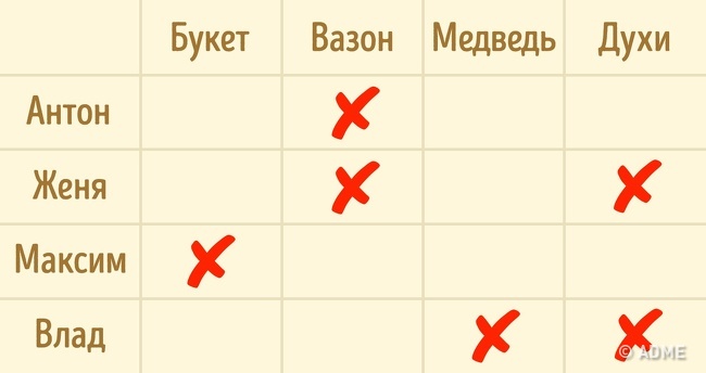 Нескладно здогадатися, дивлячись на всі три таблиці, що Антон подарував парфуми Насті, Женя — букет квітів Віке, а Максим — плюшевого ведмедя Світлі.