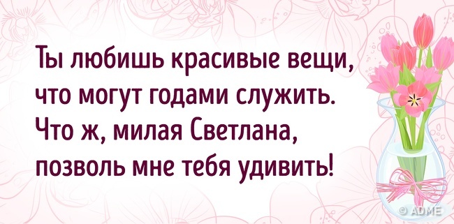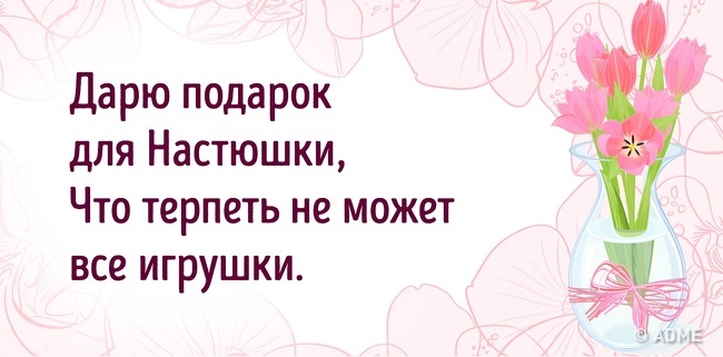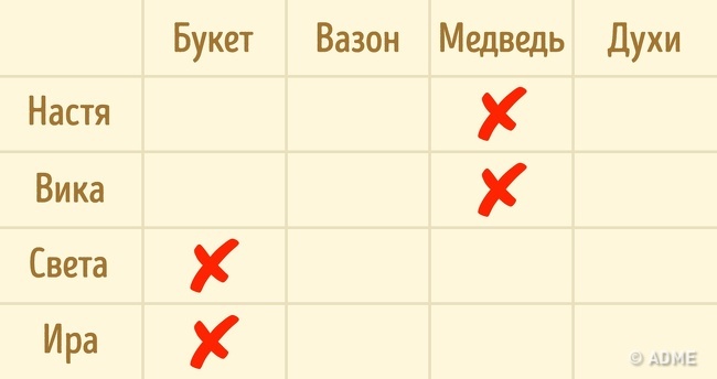 Наприклад: Світла любить речі, які можуть довго служити. Букет квітів у такому випадку ми відразу виключаємо. Подарунок Вікторії ароматний, а Настя не любить іграшки, значить, у обох дівчат точно не ведмідь. Іра не любить букети квітів, їх ми теж виключаємо.