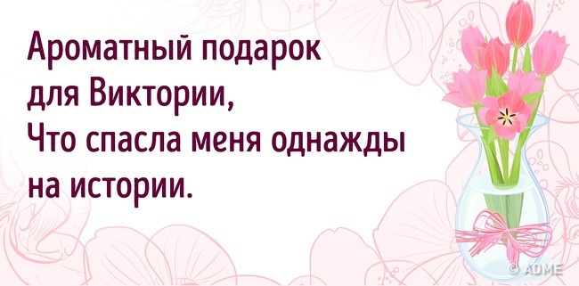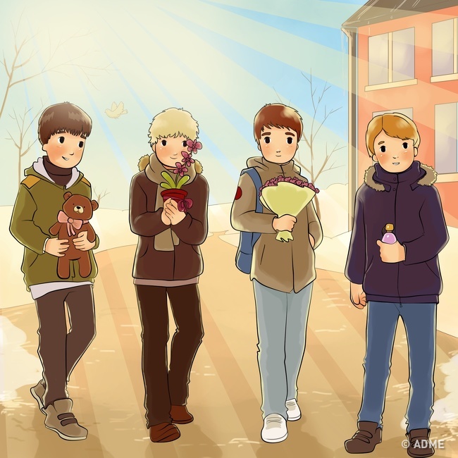 Чотири студента домовилися привітати чотирьох дівчат зі своєї групи в інституті з 8 Березня. Кожен молодий чоловік купив подарунок для певної дівчини. Тут був і букет квітів, і плюшевий ведмідь, і флакон духів, і навіть дивовижний квітка в вазоні. Хлопці купили однакові і написали на них гумористичні побажання для дівчат.