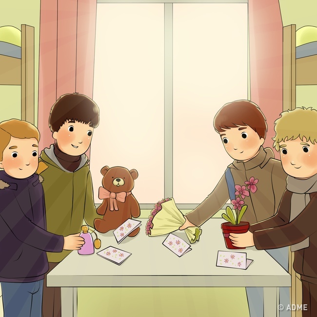 8-го березня студенти таємно пробралися в кімнату дівчат у гуртожитку і поклали на стіл подарунки для своїх подруг. Вони представляли, як зрадіють дівчата, коли повернуться додому.