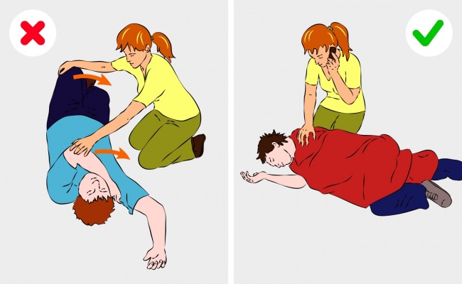 Цього робити ні в якому разі не можна, так як у потерпілого може бути пошкоджений хребет. Найменший рух при такій травмі може призвести до інвалідності або навіть смерті. У цій ситуації потрібно огородити місце події підручними предметами, щоб проїжджаючі автомобілі бачили перешкоду здалеку, і викликати швидку допомогу.