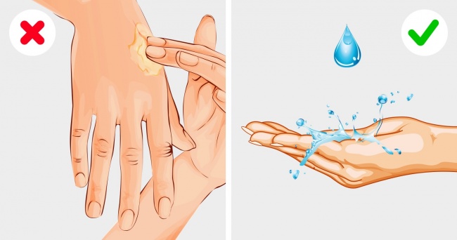 Багатьох з нас цьому вчили бабусі, але лікарі давно оскаржили цей міф. Масло, мазь і навіть «Пантенол» створюють плівку і не дають опіку гоїтися. Щоб швидше впоратися з цією неприємністю, потрібно потримати обпечену ділянку під водою 15-20 хвилин і дати ранці підсохнути. Тільки на наступний день або навіть пізніше можна намазати опік «Пантенолом».