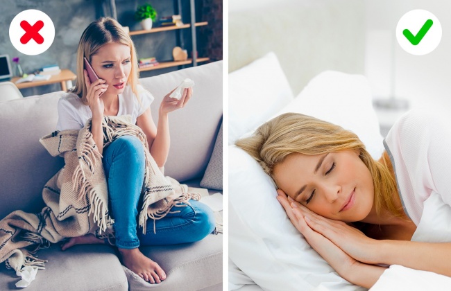 - Якщо ви змушені спати в одному ліжку з хворою людиною, лягайте «валетом» і накрывайтесь різними ковдрами.