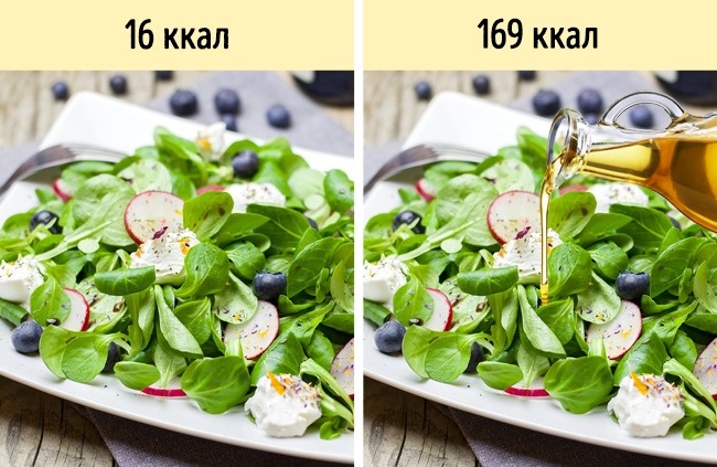 Так, якщо мова йде про салатних листках. Калорійність салату страви залежить від калорійності інгредієнтів і особливо заправки. Наприклад, популярний соус «1 000 островів» містить 370 ккал на 100 грамів, звичайний майонез — 680, а популярний соус French Dressing — 470. Але якщо в вашому салаті свіжі овочі, заправлені лимонним соком або бальзамічним оцтом, талія в безпеці.