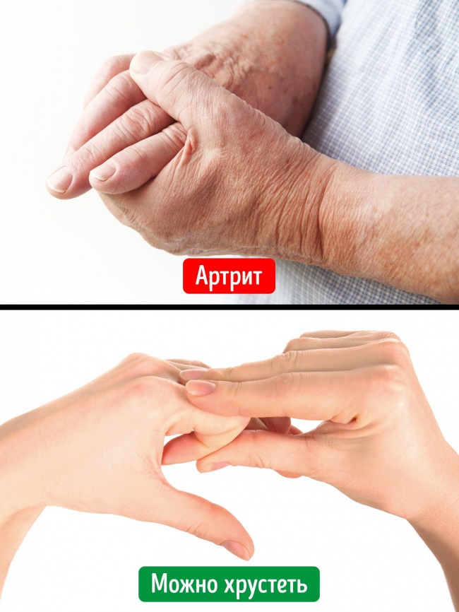 З цим пунктом знайомі дуже багато, адже навіть легкий хрускіт в пальцях відразу викликає у кого-небудь з оточуючих дивну реакцію, що супроводжується словами «будуть суглоби в старості хворіти». Але всі, хто так говорить, помиляються, тому що це зовсім не хрускіт: такий звук видають гази, які стискаються. Головною функцією цих газів є додання еластичності суглобів. Виходить, чим більше «хрумтять» пальці, тим більше в них газів і тим менше шансів у майбутньому дізнатися про артриті.