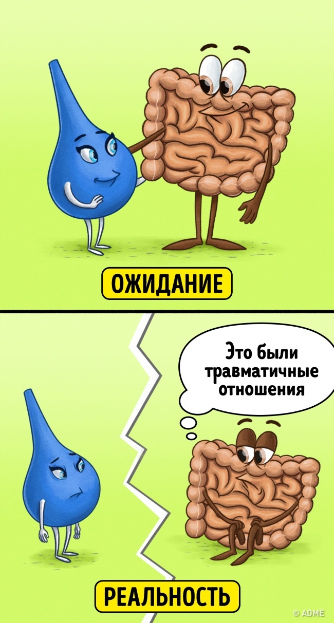 - Захоплюючись промиванням кишечника, можна погубити його мікрофлору. Є й більш серйозні наслідки: інфікування і травми кишки, а також слизових оболонок. Цілющу силу клізми давно спростували вчені.
