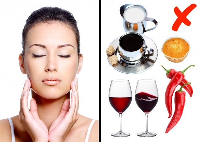 - Гострі пряності. Існує навіть таке поняття — «пряне особа». Гостра їжа розширює судини, тому почервоніння і судинна сіточка часто докучають любителькам «подихати вогнем».
