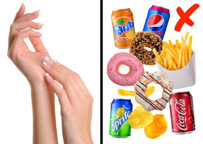 - Жирні продукти та солодощі. Для здоров'я нігтів всі потрібні речовини повинні засвоюватися організмом. Надмірна кількість жирів у раціоні заважає всмоктуванню кальцію, і нігті стають ламкими.