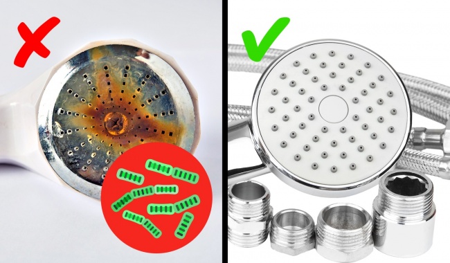 Процвітання мікроорганізмів в душовій лійці сприяють тепла температура та вода. Якщо ви вибираєте пластикову лійку, бажано, щоб вона була розбірної і її можна було продезінфікувати. Або ж просто міняйте лійки частіше. Проте краще всього використовувати виріб з металу: при температурі воно не виділяє токсинів.