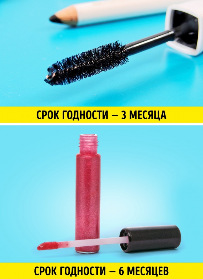 Лікарі рекомендують використовувати туш не більше 3 місяців після відкриття упаковки. Ми переносимо на слизову оболонку ока безліч бактерій, число яких тільки збільшується з кожним разом, чому сприяють вологе середовище і кімнатна температура. А блиск для губ краще викинути, як тільки з'явиться запах. Зазвичай це відбувається після 6 місяців використання.