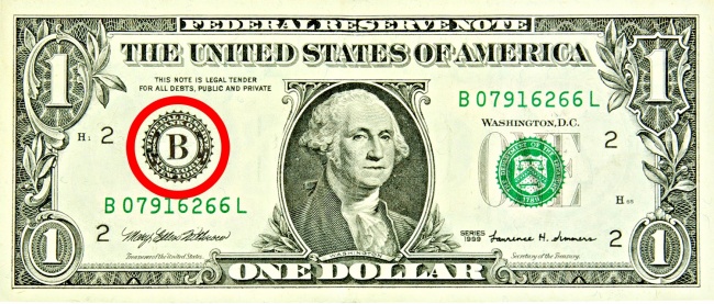 Цей знак складно не помітити, так і не таємний він тут зовсім. Буква позначає певний банк Федерального резерву, в якому була надрукована купюра.