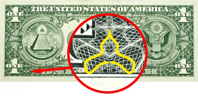 На однодоларовій купюрі є велика кількість символів, які трактуються багатьма як масонські. І є люди, які скрупульозно видивляються в її окремих елементах прихований сенс. Версія, що ці знаки виготовлялися з метою боротьби з фальшивомонетниками, для них не пріоритетна.
