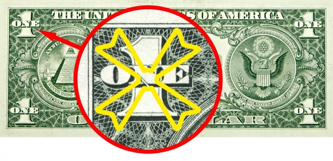 Якщо добре придивитися, то за одиницями на кожному з 4 кутів із зворотного боку долара можна розгледіти форму, що нагадує хрест або крила млина. Деякі бачать в ньому так званий мальтійський хрест як натяк на знаменитий орден, лицарі якого були вислані Наполеоном в Америку.