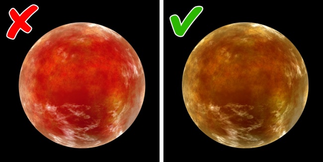 Марс, який часто називають «червоною планетою», має у своїй атмосфері великий вміст пилу з оксидів заліза. Саме із-за нього з далекої відстані колір планети може змінюватися від рожевого до бурого. Насправді ж Марс, швидше, коричнево-золотий.