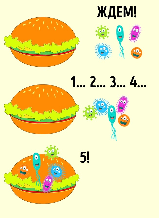 Якщо у вас все ж були сумніви щодо «правила 5 секунд», або, як більш поширене в російській варіанті, правила «швидко підняте не вважається впало», то у нас є для вас довгоочікувана ясність. Результати дослідження, проведеного в Ратгерском університеті (США), показують, що 5 секунд виявляється більш ніж достатньо для потрапляння бактерій на їжу. Кількість мікробів залежить від середовища і типу поверхні, але в будь-якому випадку зараження їжі відбувається миттєво.